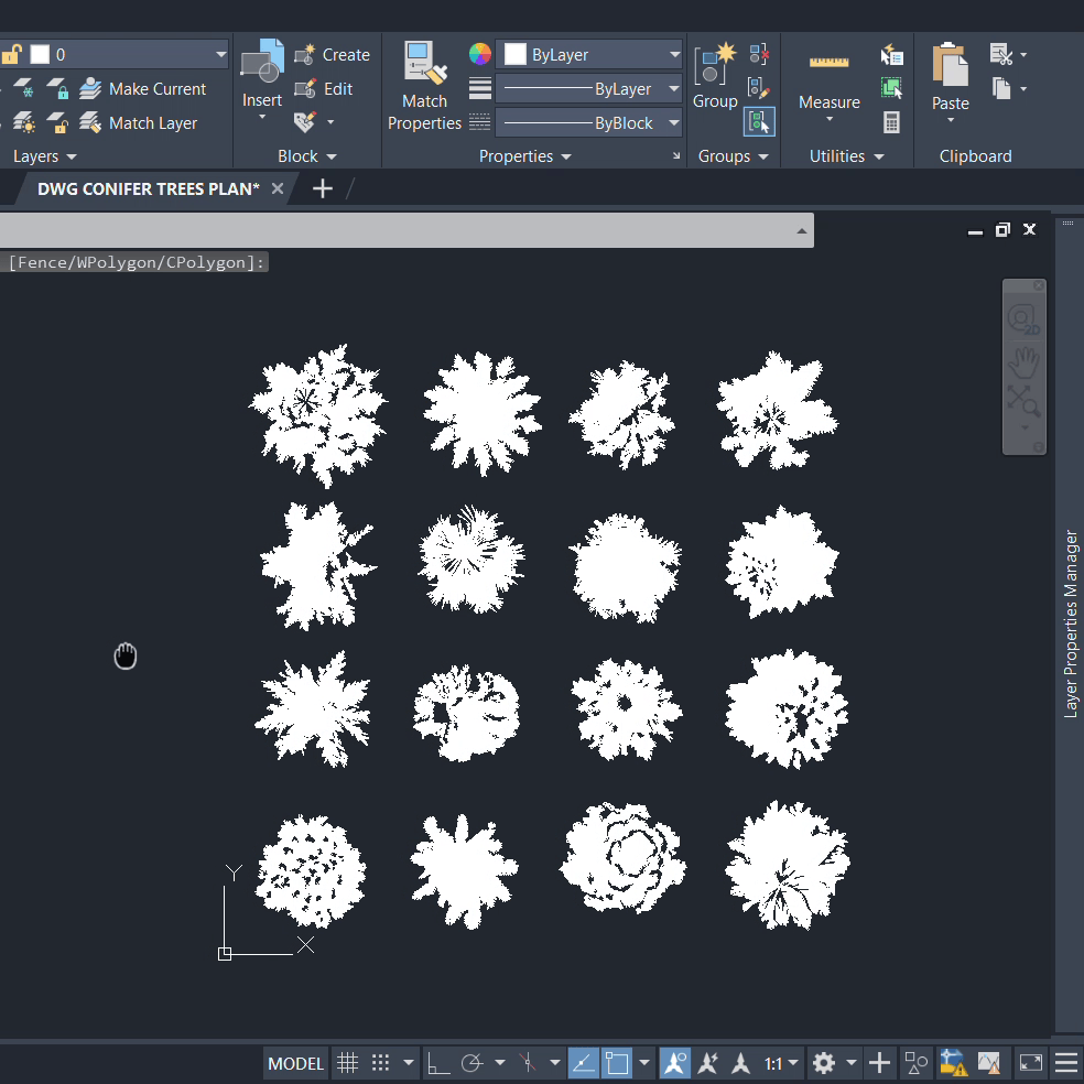 The product contains one dwg. file with separate hatched blocks of each individual tree for easy use. It contains both hatch blocks and polyline blocks to use in different style drawings.