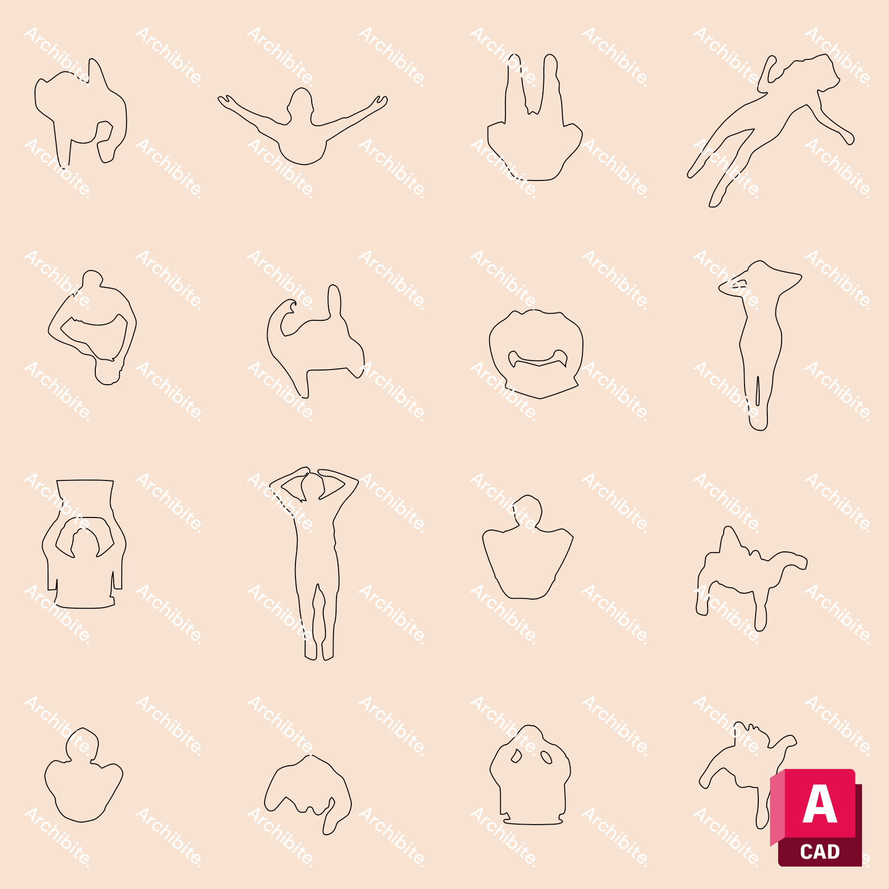 16 different top view DWG people in different positions for your floor plans and detail drawings. These DWG blocks are incredibly high quality and 100% scalable to any size. They are especially good for stylized floor plans, but suit other drawings as well.